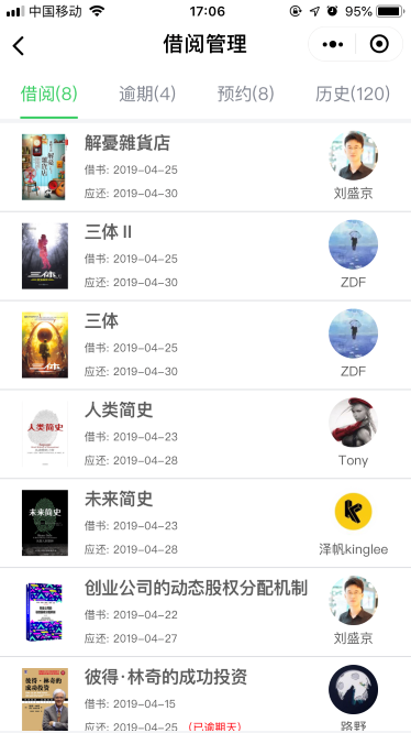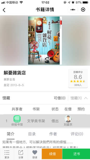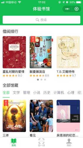 番薯借阅——您的掌上藏书借阅管理平台! 番薯借阅以微信小程序版为主,网页版为辅https://www.fanshuquan.club 1)移动化:管理员可随时随地「掌」控书馆运营状况,读者足不出户实现查询/预约/续借等操作; 2)信息化:自建2000+万书籍ISBN数据库,覆盖几乎所有中英文书籍。