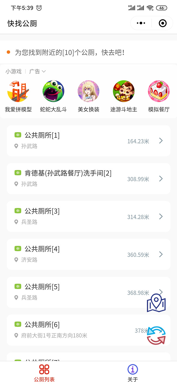通过地理位置定位快速带你找到附近公厕,嘘嘘嘘,拉粑粑。