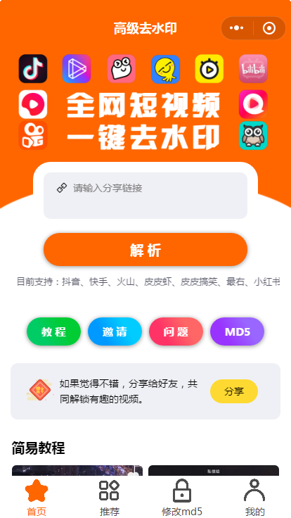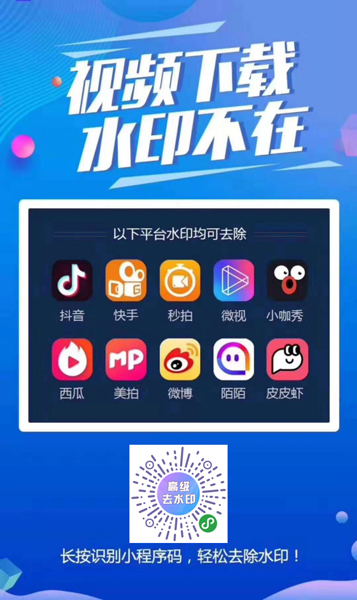 高级去水印小程序功能: 1、一键去除水印,只需要复制视频地址就能轻松去除视频带的水印; 2、全程免费,操作简单,还有详细的教程手把手你叫怎么使用; 3、支持抖音快手等各大热门短视频平台,去掉水印后还能下载导出。 高级去水印小程序亮点: 1、能修改视频MD5值,你也能直接上热门了,玩美修改不影响质量; 2、目前市面上流行的平台都支持,功能齐全操作简单实用;
