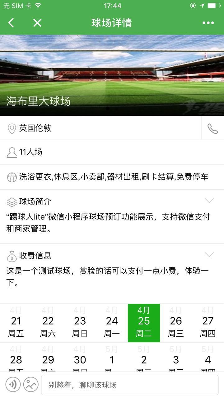 一款提供给踢球爱好者在线预订足球场地的小程序,同时也支持场馆商家管理平台