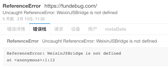 对于Fundebug这样一个没有使用微信JS-SDK的产品来说,我们竟然收到了WeixinJSBridge is not defined 的报错: