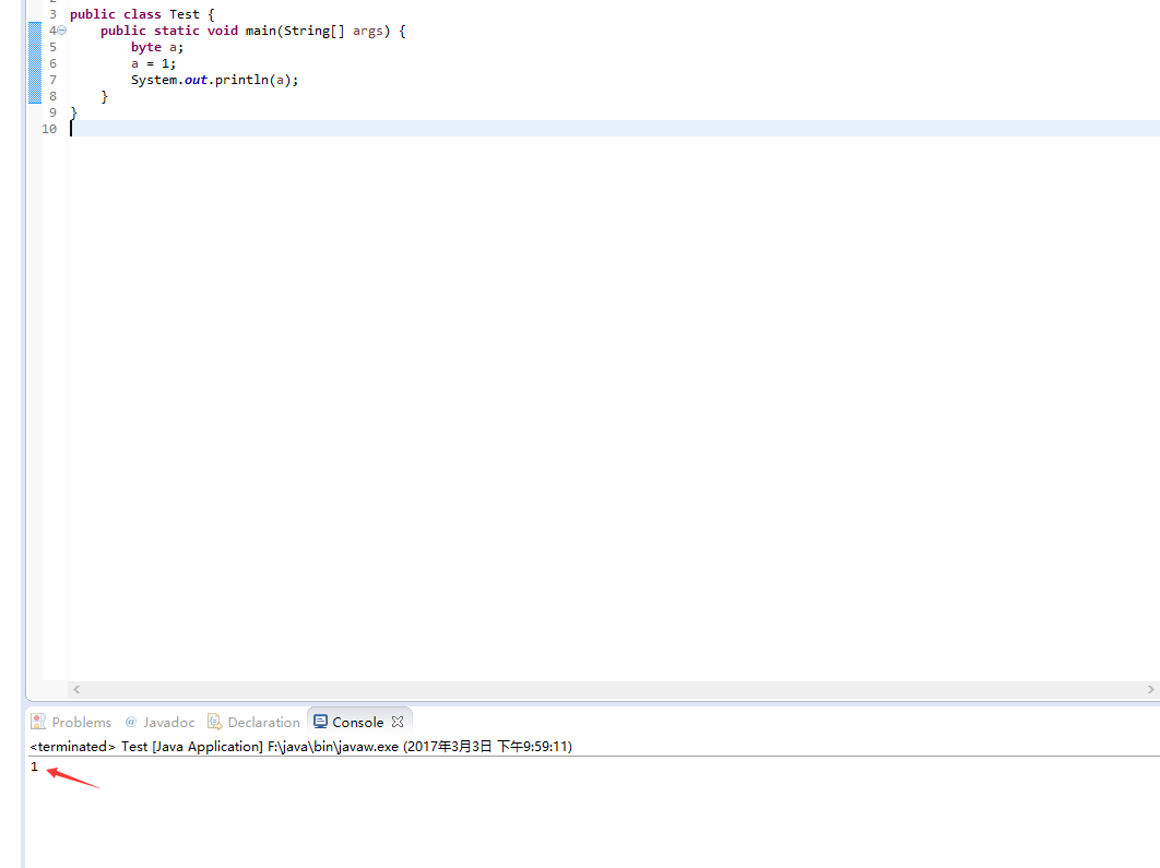 我们先声明一个byte类型的数然后打印这个变量在main方法里写上下面代码