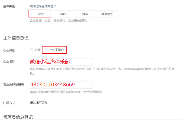 企业 -> 个体工商户,使用企业名称:微信小程序俱乐部,以及其 营业执照注册号:440301103448669