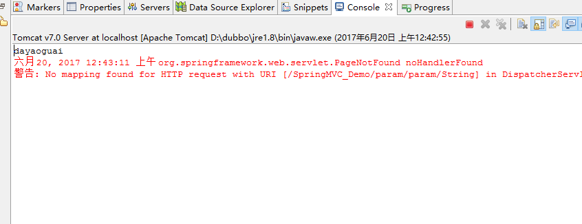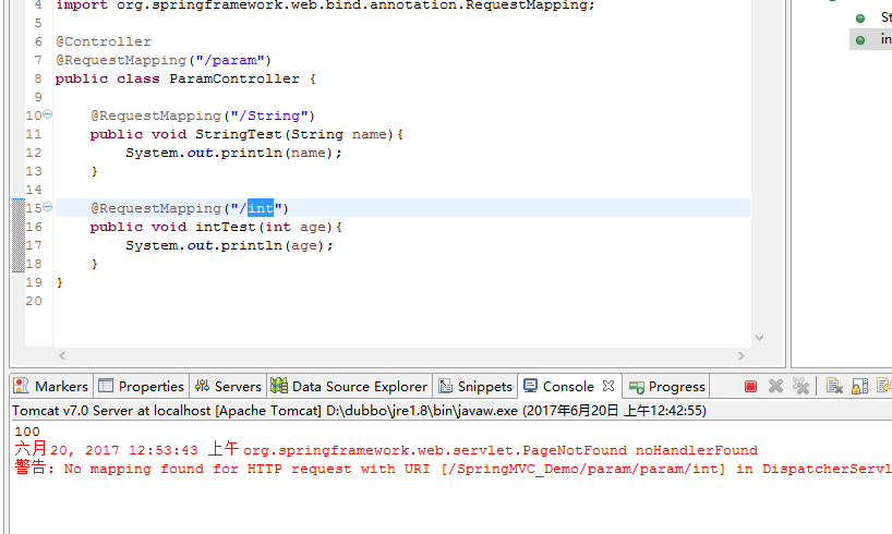 当我们传入的是一个参数,访问的时候,SpringMVC不仅会通过RequestMapping来匹配方法,同时还要根据参数类型来确定方法。因此在这我们没有访问到要访问的方法。
