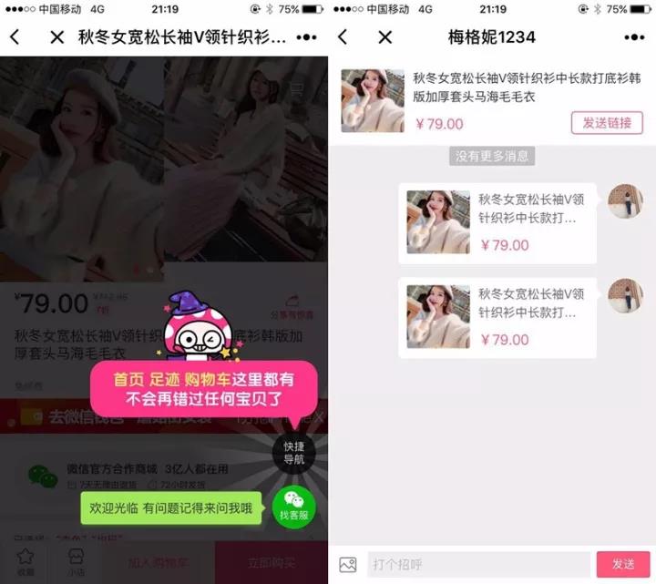 在“双11”前,蘑菇街小程序就上线了小程序客服系统,进入蘑菇街小程序点开商品后,就会出现小程序客户服务工具头像及“欢迎光临,有问题记得来问我哦”的客服文字提醒,点击头像就打开消费者与商家直接沟通的界面了。值得注意的是,就算消费者退出小程序,也可以在微信聊天页面实时收到客服的回复信息,点击即可进入聊天页面。