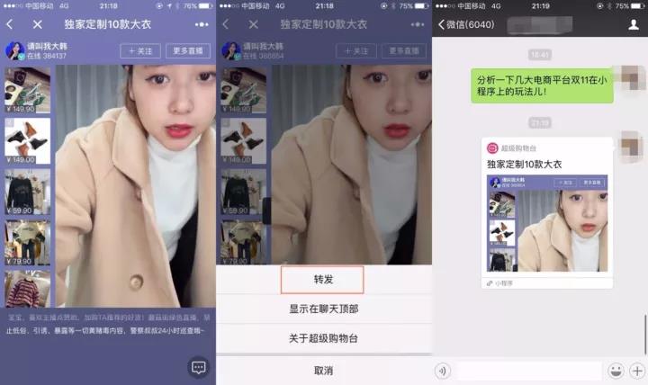 小程序支持群分享功能,店铺可以以“直播间”的形式一键分享到粉丝群,而粉丝一步的自发性分享,又为店铺带来新用户。