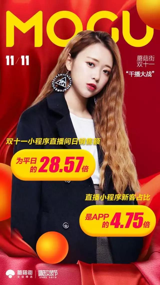数据显示,蘑菇街小程序直播间的日销售额达到平日28.57倍;直播小程序新客占比是APP的4.75倍。