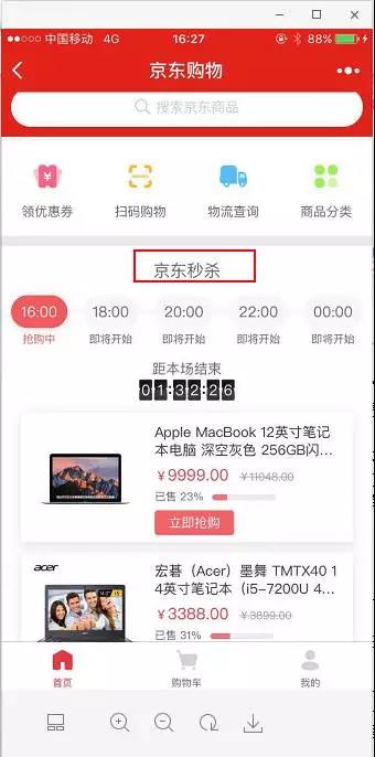 “京东购物”小程序的首页突出的则是秒杀,值得注意的是,这些秒杀的产品都以3C为主,这也是京东起家的强势业务。