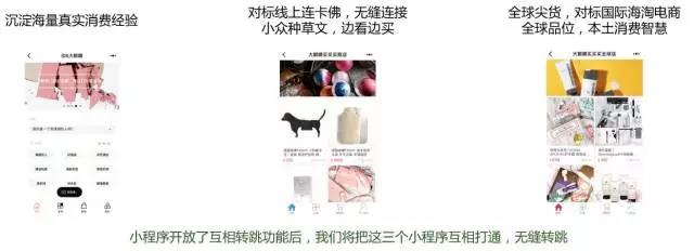 还能蹭自己的流量。据悉,时尚博主于小戈有三个小程序,一款用来让用户种草,分享全球好物;一款给用户拔草,“种草”后想买即可跳转至另一款小程序“拔草”;第三个小程序是提供给较为高端的用户来拔更好的草。这三款小程序相互打通,并且都能通过公众号跳转至小程序,用户可自由跳转,实现买买买!据悉,“于小戈”订阅号有70万粉丝,两款电商小程序11月上线以来,到现在平台日均总交易额达到120万元!