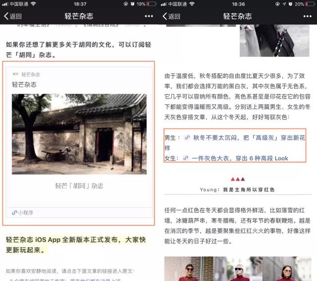 以内容为主的“轻芒”小程序同样如此,在公众号中植入的小程序卡片、文字都是高频入口,这种方式在高质量的文章中,用户完全不会觉得有所突兀。