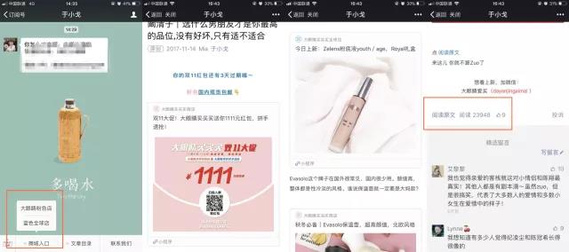 首先,她把小程序的入口装进微信公众号的各个角落。小柠转了一圈“于小戈”公众号,除了公众号主体有展示关联的小程序和聊天框底部有小程序入口外,大多数文章中都有不下3处植入小程序卡片。用这种方法结合公众号优质内容,于小戈公众号的流量转化比是点击阅读原文流量转化比的500倍!