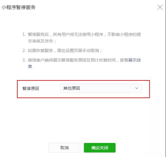 “暂停服务”中,有一栏让你选择“原因”,既然已经“不爱”了。也不用选择什么“预计恢复时间”,直接设置“其他原因”,所有用户将无法使用小程序。