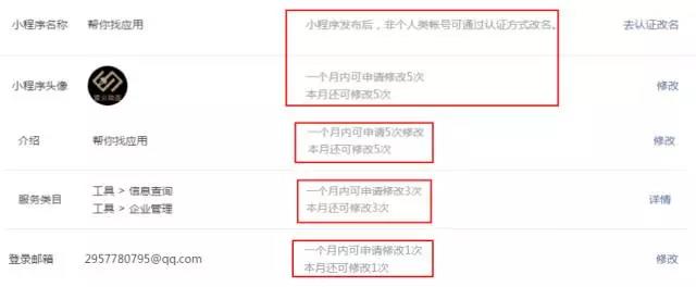 首先,修改头像、名称、简介、服务类目、登录邮箱。个人为主体的小程序1年可修改2次名称,其他小程序都需认证后改名,300块一次;头像和简介每个月可以改5次(小店不能改头像);服务类目1个月可改3次;邮箱每个月可改1次。