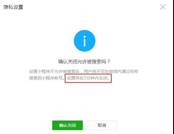 还是基本设置中,找到“隐私设置”点击“关闭”,关闭5分钟后生效。至此你的小程序大家再也搜索不到,就算找到也无法使用,是不是相当于注销?