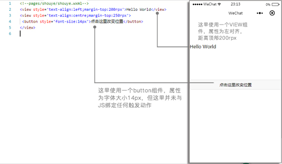 接下来,我们通过增加JS代码,同时与WXML绑定,来实现以上大家所看到的效果:当你不停地点击按钮,可以看到“Hello World”的位置在不停地改变。