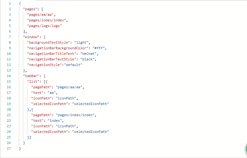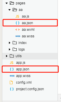 如小程序包含a页面也b页面,他们之下的文件分别以aa或bb命名,如aa.js、aa.wxml、bb.wxss等,那么app.json中的页面配置如下: