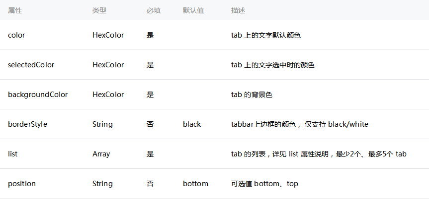 值得注意的是,尽管官方文档中color、selectedColor、backgroundColor和list均属于必填项,但实际上如对tabbar无特别的视觉要求,仅填写list即可。
