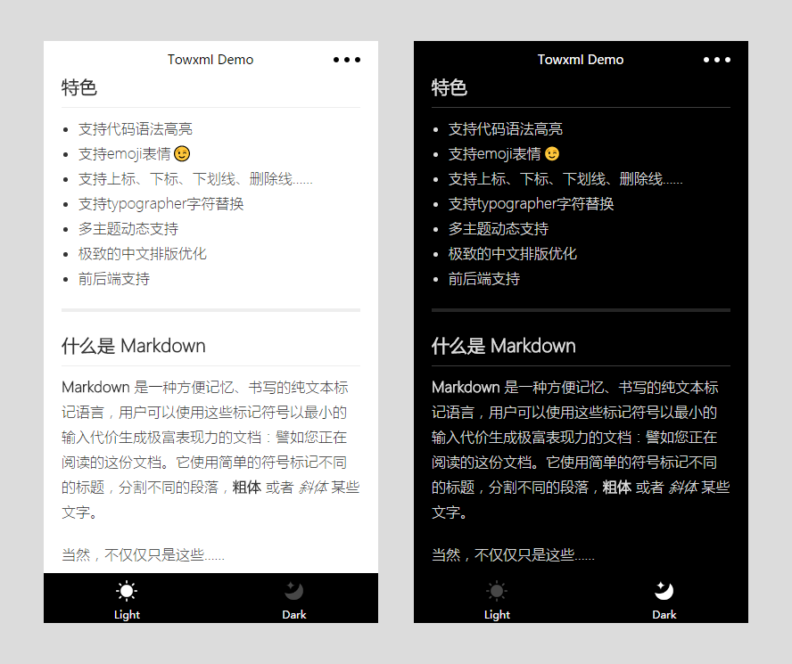 Towxml 是一个可将HTML、Markdown转为微信小程序WXML(WeiXin Markup Language)的渲染库。
