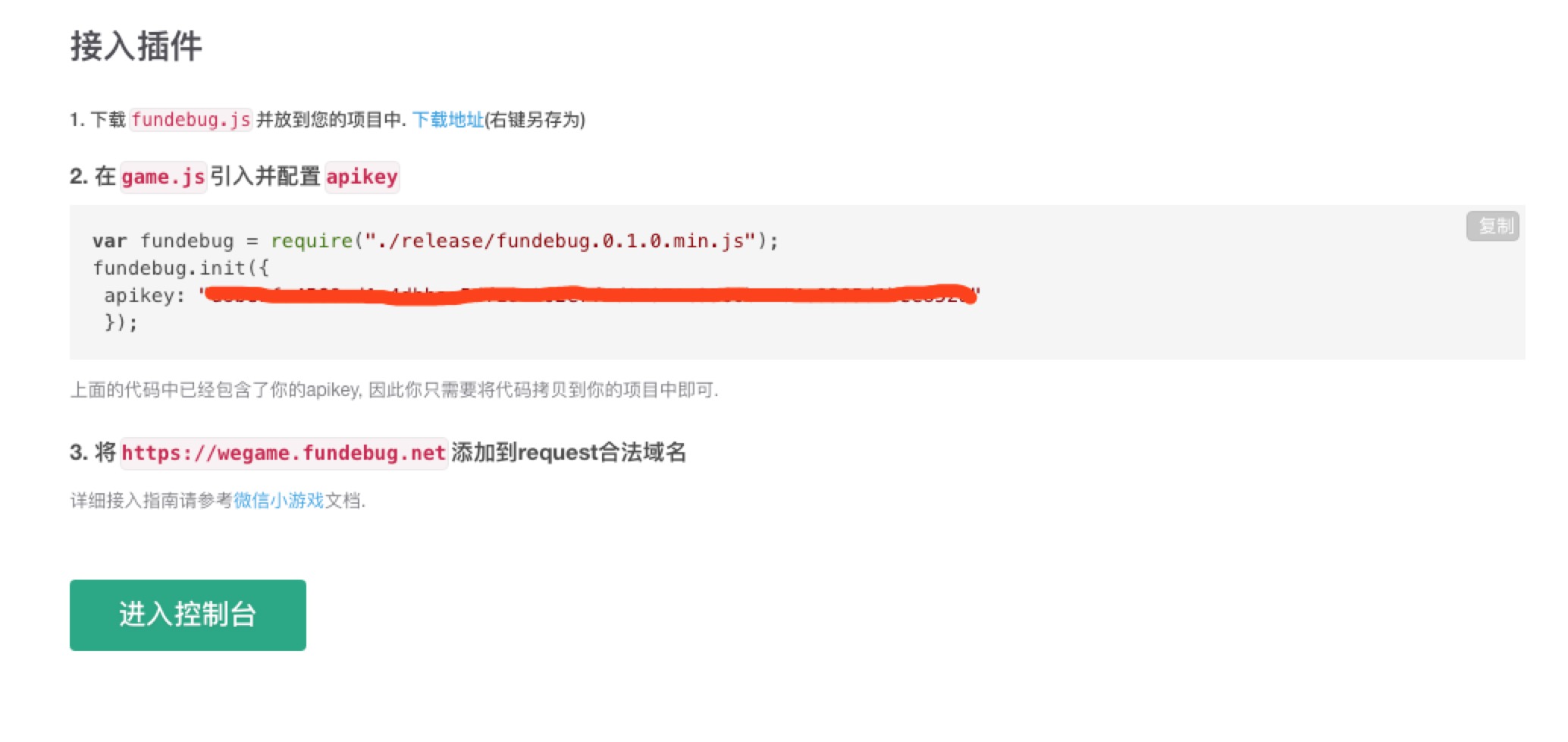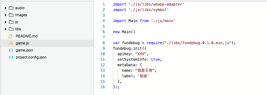 第三方插件在小游戏的接入流程和小程序是类似的,你需要将插件代码下载到本地,放到自己的项目中。并且需要将Fundebug的接收域名配置到request合法域名。
