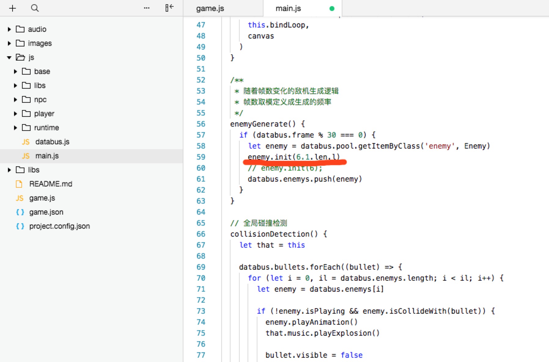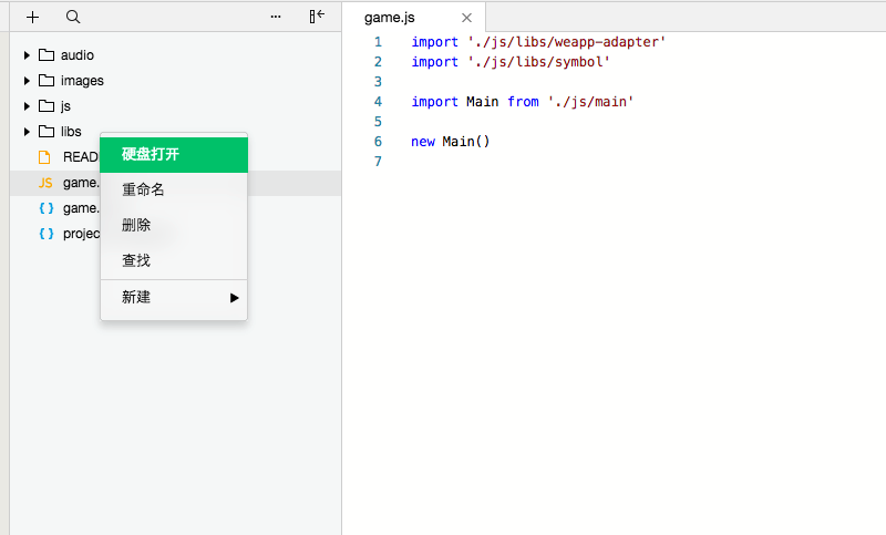 使用无AppID模式创建一个微信小游戏后可以看到官方demo,其中入口文件和配置文件:game.js和game.json。game.js引入并初始化包含整个打飞机的游戏场景、参与者(玩家飞机和敌方飞机)、游戏逻辑的主函数的main.js。