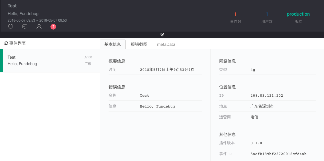 Fundebug的控制台就可以看到这条报错的信息了: