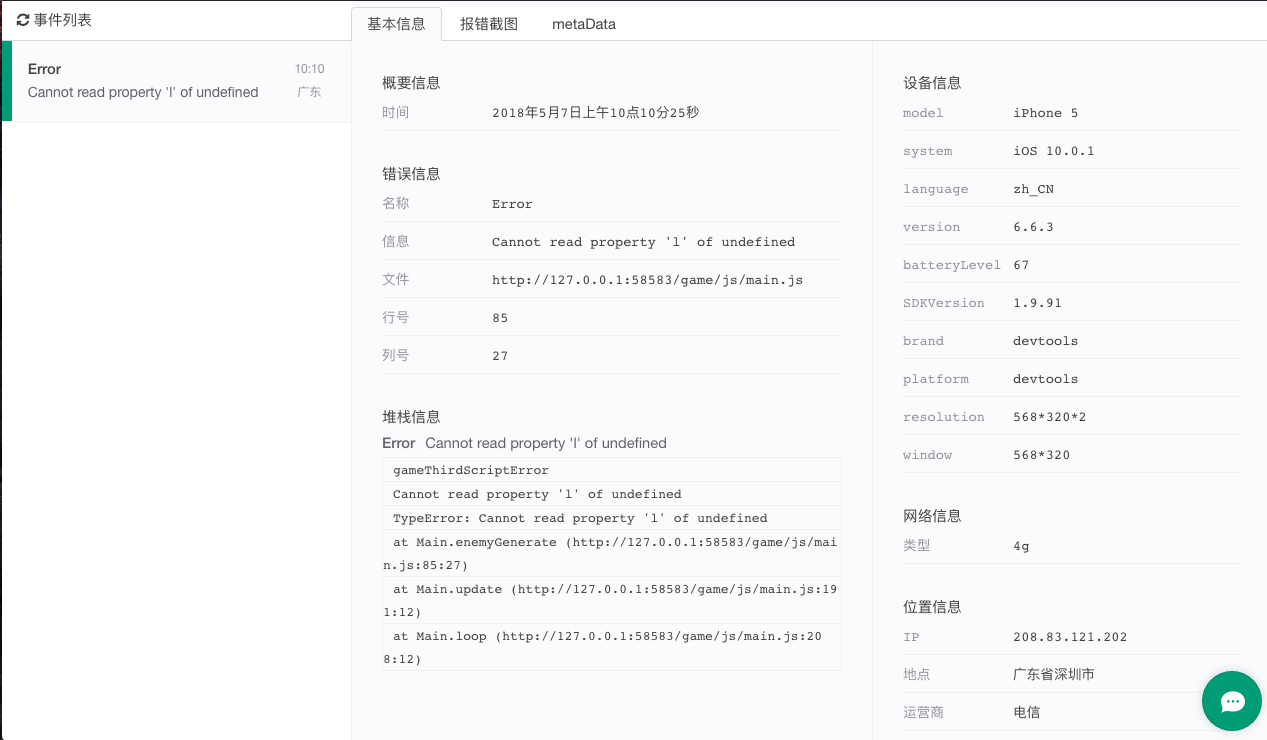 点击,可以查看信息的报错信息,包括设备信息都显示出来了。