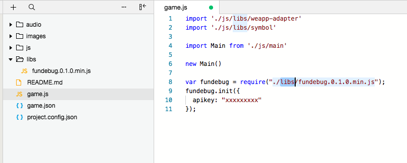 然后再game.js文件中引入,记得将复制的代码中的release改成libs。