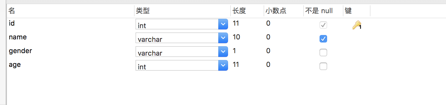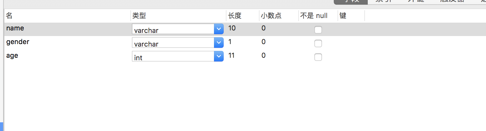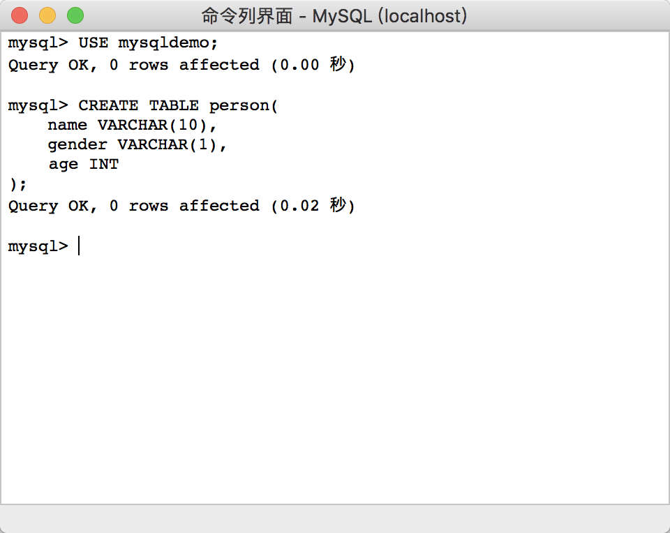 其中VARCHAR和INT都是字段的数据类型,VARCHAR是字符串类型,后面小括号里的数字是设置字段的长度,这个是必须的。CREATE TABLE person(