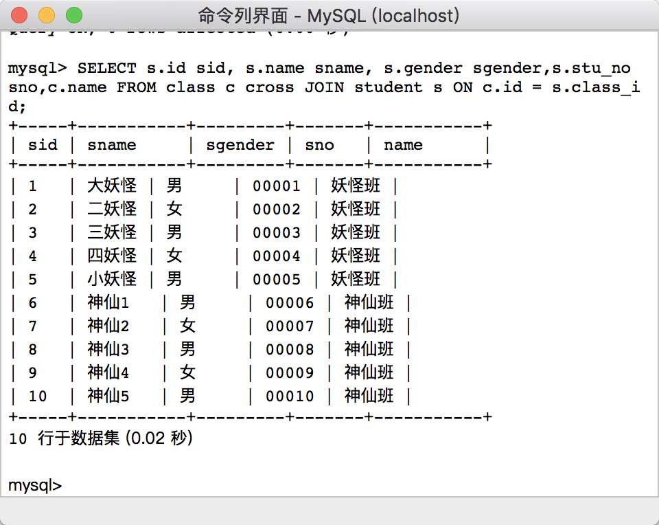 SELECT s.id sid, s.name sname, s.gender sgender,s.stu_no sno,c.name FROM class c cross JOIN student s ON c.id = s.class_id;
