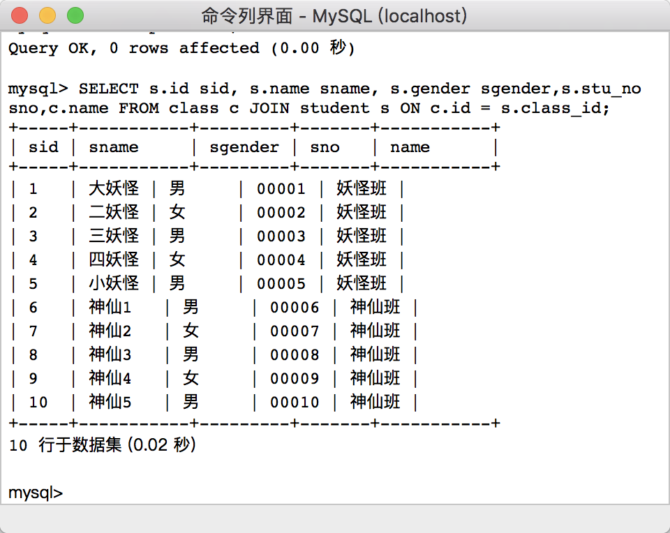 SELECT s.id sid, s.name sname, s.gender sgender,s.stu_no sno,c.name FROM class c inner JOIN student s ON c.id = s.class_id;