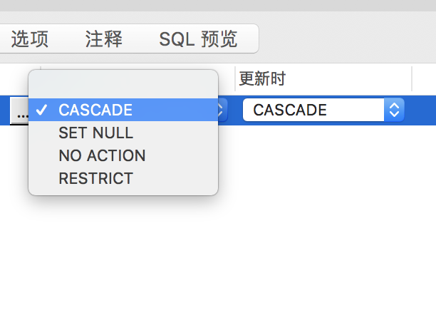 我们可以找到,设置外键的时候,删除时和新增时都有四个选项: