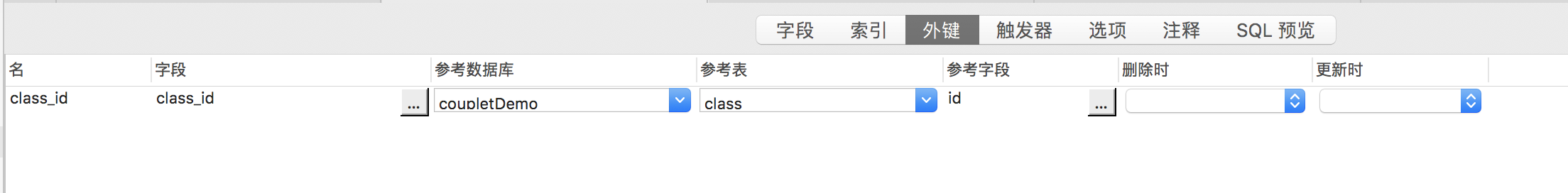 这句话是说引用class表的id字段到student表的class_id字段作为外键,查看外键,可以发现创建出来的外键删除时和更新时都是默认的: