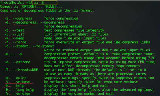 在Linux中可以使用类似xz -h这样的命令来查看xz命令的参数及作用的简介,也可以使用man xz, 查看工具或者系统提供的手册,这个是信息最全的查看方式