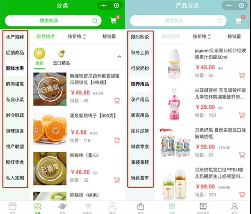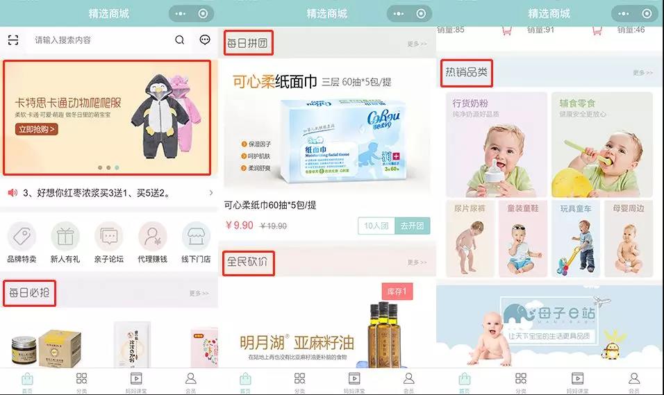 下面举例的母子e站和鲜优优,都是根据自家产品的品类划分不同模块,主题名称都简单明了。