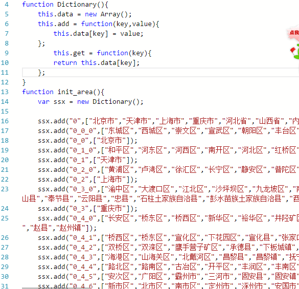 不过目前我们能做一件事,那就是在坐等的同时动动手,虽然插件不能引入,但是插件里的数据可以拷贝呀,就比如现在这个省市级三级联动,上一位同志只封装了几个栗子,那全部的城市难道都要这样一个一个手写上去吗?当然不要,我上网搜出了一些js插件,手动的拷贝出需要的数据即可