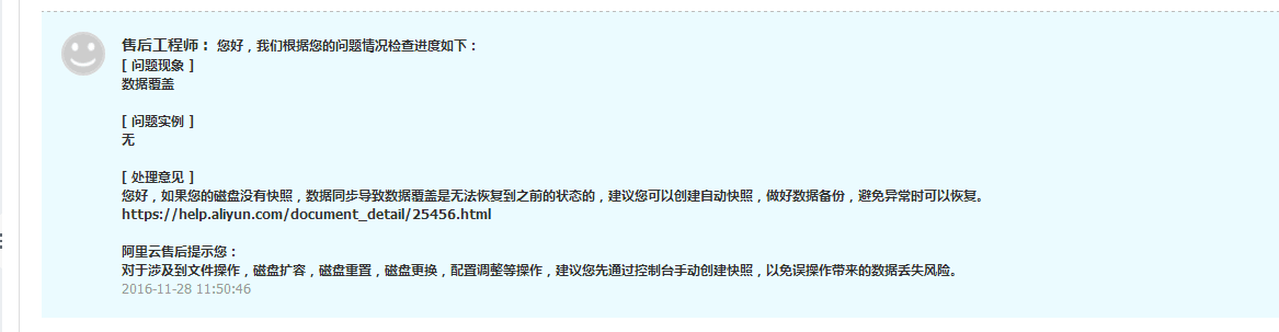 当时第一反应是找阿里云系统快照,毕竟我记得是设置了自动策略的,然而当我打开策略,我又懵逼了,0个快照!!!好吧,这个后来才知道今年啥时候给取消自动快照了需要手动备份。为了这个,还和阿里云客服妹子发生了以下对话才死心: