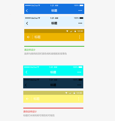 (1)微信导航栏,直接继承于客户端,除导航栏颜色之外,开发者无需亦不可对其中的内容进行自定义。选择的颜色需要在满足可用性前提下,和谐搭配微信提供的两套主导航栏图标。
