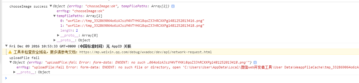 "uploadFile:fail Error: form-data: ENOENT: no such file or directory, open 'C:UsersUserAppDataLocal微信web开发者工具User DataWeappFileCache mp_332869064o6zAJszM4VTYHXl8qoZ3JhRCXXPg1481252013416.png,wxfile: mp_332869064o6zAJszM4VTYHXl8qoZ3JhRCXXPg1481252013418.png'"
