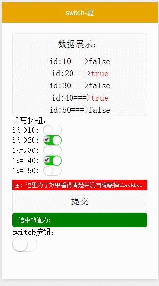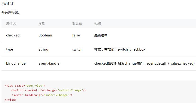 type: switch为滑动按钮样式,checkbox为复选框样式(与组件checkbox有点像,一会儿说区别)