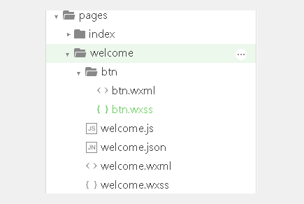 (3)按照下图在 welcome 文件下新建一个 btn 文件,并在其中 创建 同名的 wxml、wxss 文件。注意:btn 路径不需要配置在 app.json 的pages 中,因为该内容是一个模板组件,而不是一个需要被app管理路由的页面