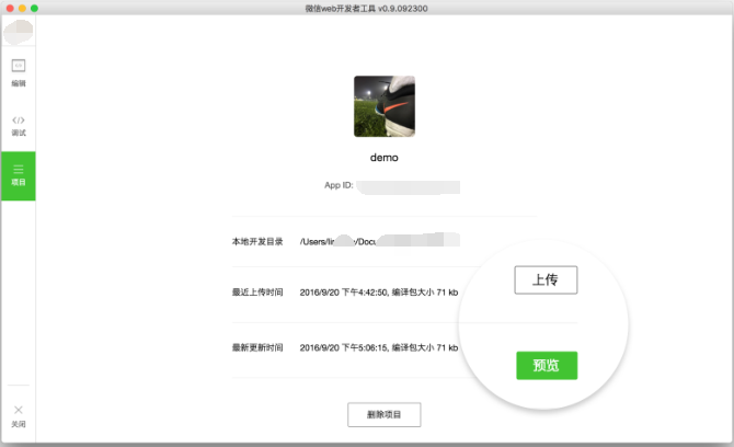 11>开发者工具左侧菜单栏选择”项目”,点击”预览”,扫码后即可在微信客户端中体验,至于如何获取开发工具,请参考社区的其他文档,在这就不多说了