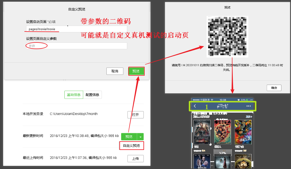 笔者费尽九牛二虎之力,终于把两个不相关的内容联系在了一起,原来开发工具中的自定义预览就是所谓的带参数的二维码。