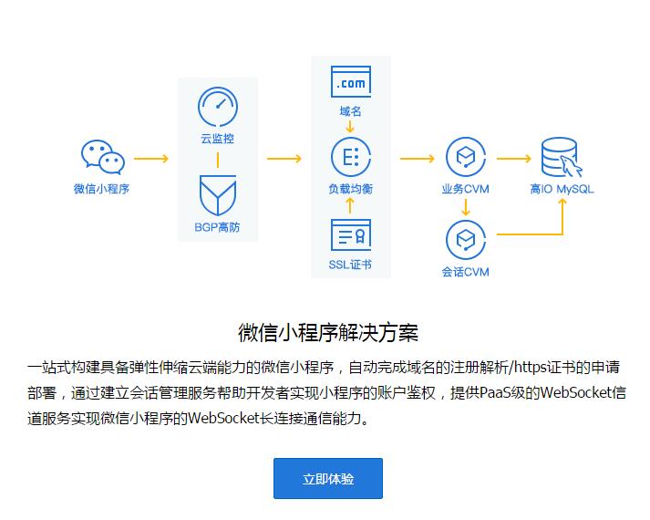 一站式构建具备弹性伸缩云端能力的微信小程序,自动完成域名的注册解析/https证书的申请部署,通过建立会话管理服务帮助开发者实现小程序的账户鉴权,提供PaaS级的WebSocket信道服务实现微信小程序的WebSocket长连接通信能力。